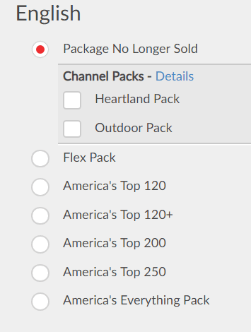 The channels for that pack are on the DISH website under english packs. All packages programming features and functionality and all prices and fees not included in price guarantee are subject to change without notice. Top 120 Top 200.