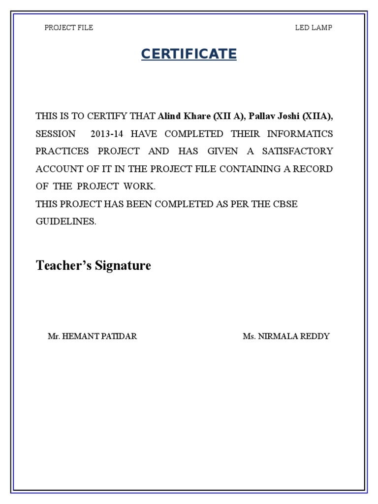 Teachers name sirmaam during the academic year 2018-2019 as per the guidelines issues by central board of secondary education - cbse. This is hereby to certify that the original and genuine investigation work has been carried out to investigate about the subject matter and the related data collection and investigation has been completed solely sincerely and satisfactorily done by Vinay Ranjan Jaiswal a student of class12 under the Roll no-37 for the academic session 2016-2017 Regarding the investigatory. Inch posted to College term is a legitimate record with the Certificate For School Project with regards to university job designers and customers non-public sector individuals acquire a license of teaching conclusion that is Institution certificate layouts are very easily available in the net for cost-free or most likely paid straight down load and can quickly be.